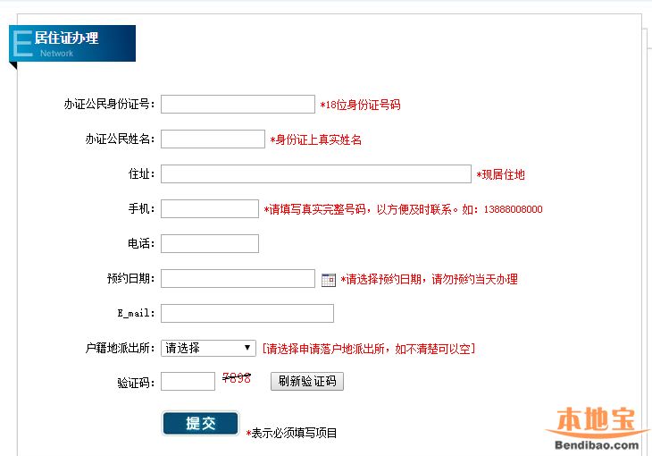 所需填寫的信息包含:辦證公民身份證號(hào)、辦證公民姓名、住址、手機(jī)、電話、預(yù)約日期、E_mail、戶籍地派出所、驗(yàn)證碼;
