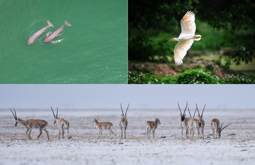 這是一張拼版照片:左上圖為在湖北省宜昌市江邊,長(zhǎng)江江豚在水中嬉戲(無人機(jī)照片,新華社記者肖藝九5月11日攝);右上圖為陜西省漢中市洋縣朱鹮生態(tài)園內(nèi)的朱鹮(新華社記者劉瀟5月13日攝);下圖為藏羚羊在三江源可可西里地區(qū)活動(dòng)(新華社記者吳剛4月20日攝)。新華社發(fā)