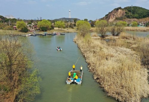 2021年2月24日,浙江湖州吳興區(qū)八里店鎮(zhèn)移沿山村河長(zhǎng)帶隊(duì)在移沿山村開展巡河、保潔作業(yè)(無人機(jī)照片)。新華社記者 翁忻旸 攝