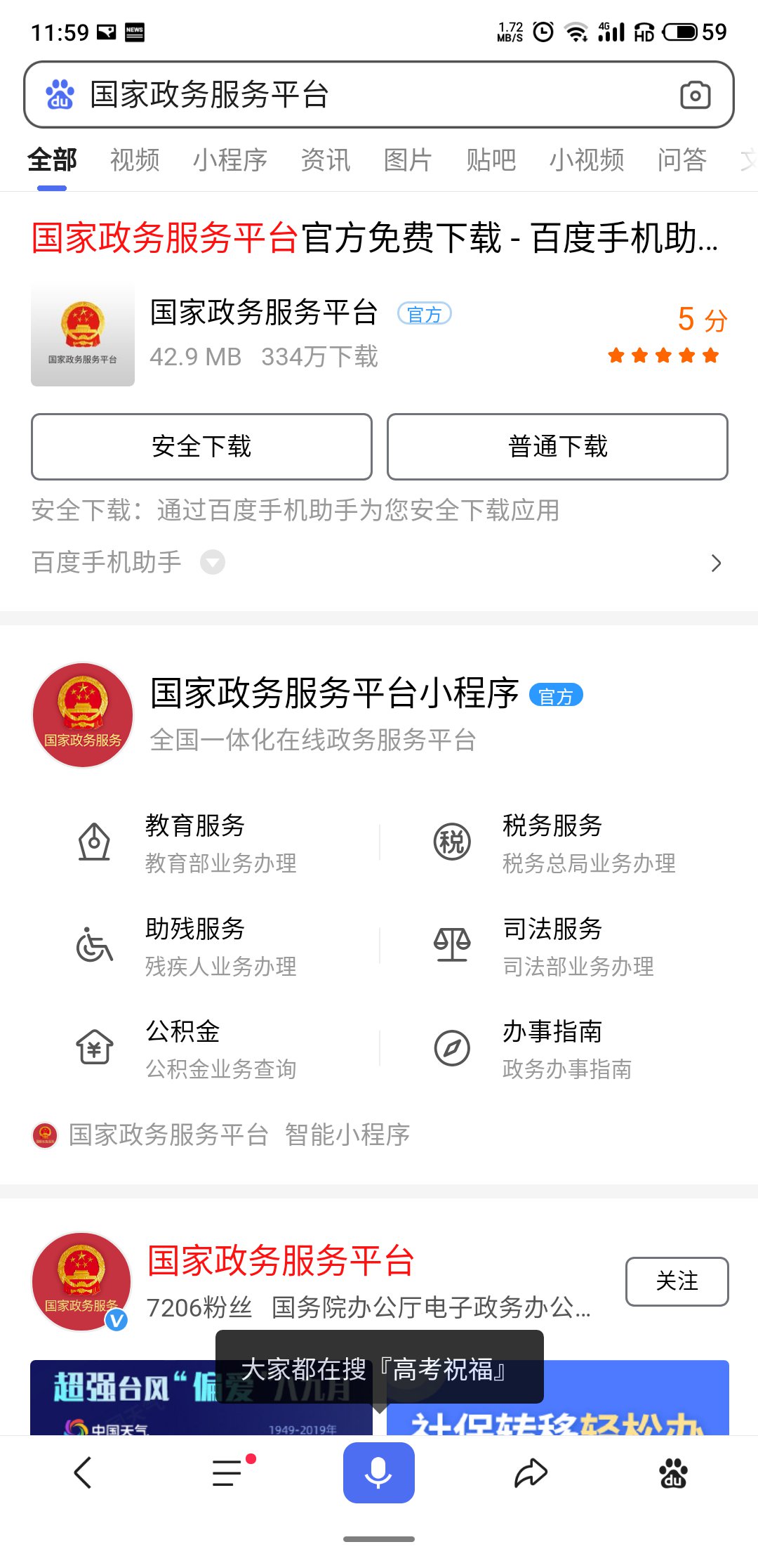 第一步:進入百度,搜索國家政務服務平臺小程序,進入小程序,找到教育服務,點擊『更多』