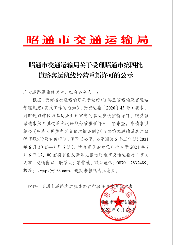 昭通市交通運(yùn)輸局關(guān)于受理昭通市第四批 道路客運(yùn)班線經(jīng)營(yíng)重新許