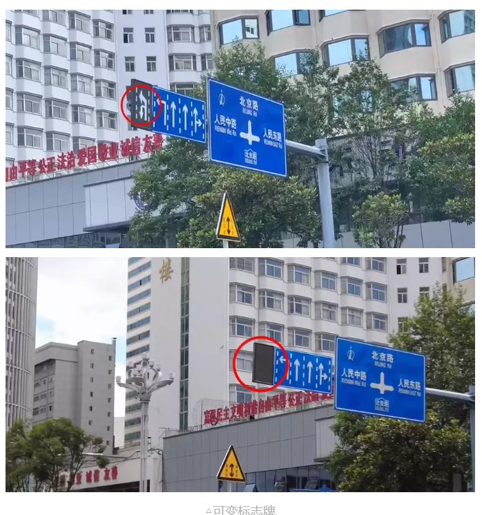 路口的可變標(biāo)志牌會(huì)根據(jù)潮汐車道的變更,顯現(xiàn)與之相對(duì)應(yīng)的指示標(biāo)志,便于過往車輛識(shí)別通行。